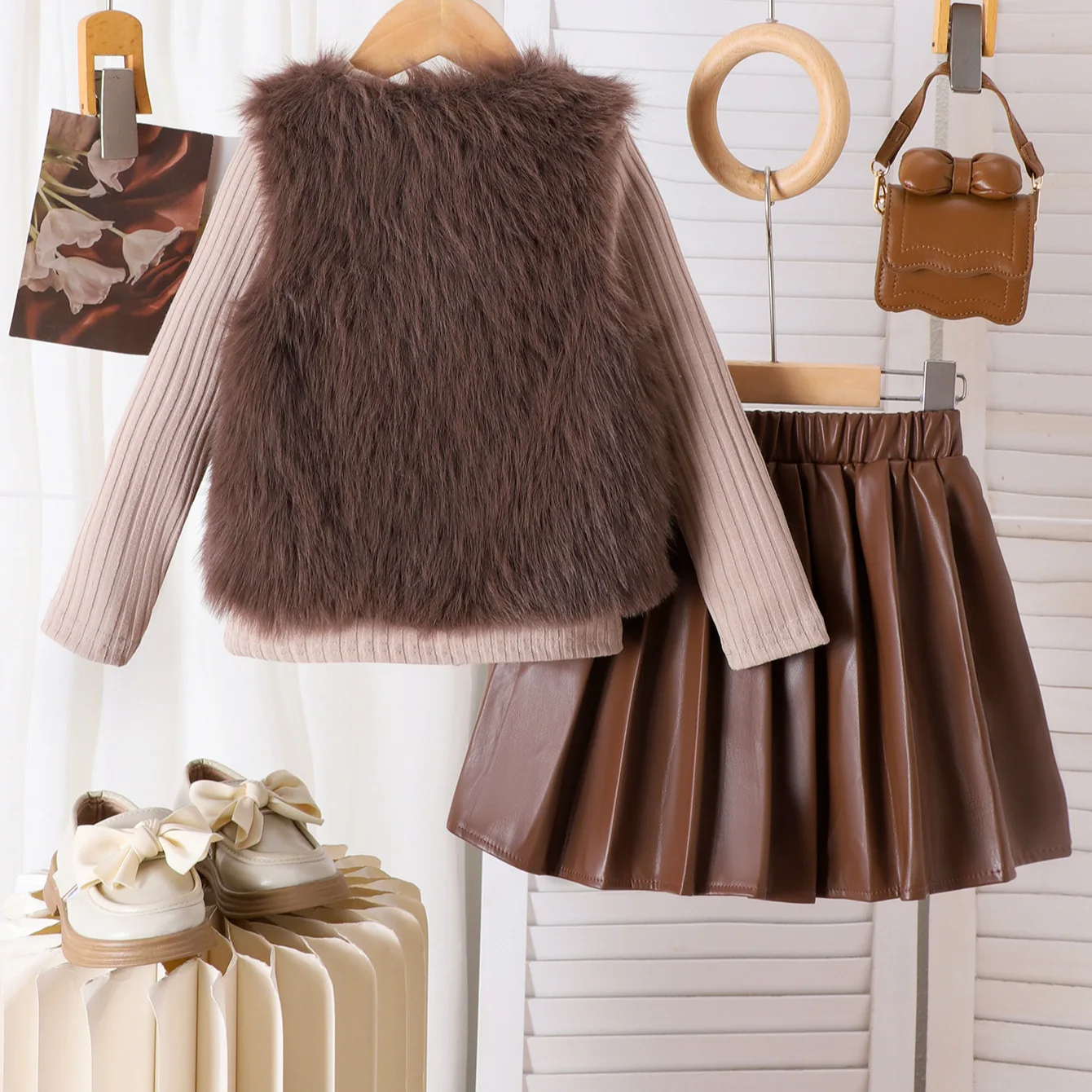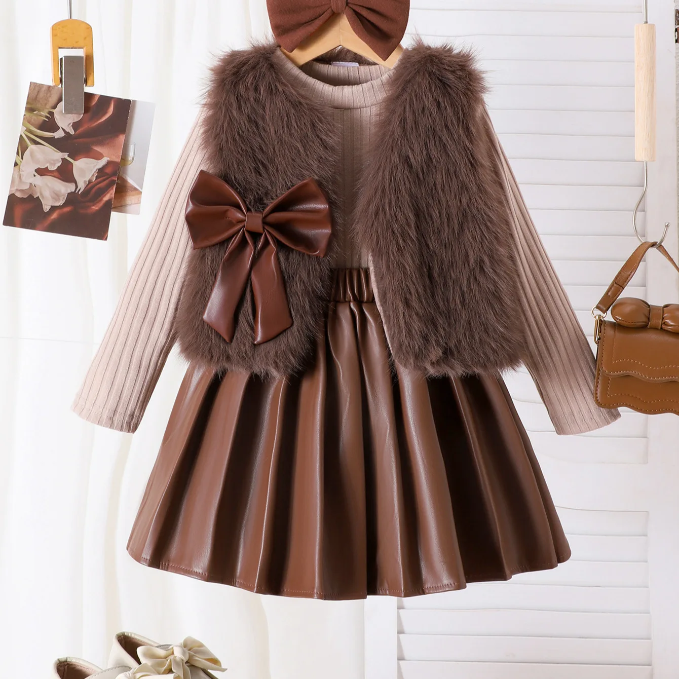 2026 Autumn Winter 4-7Y Girls Clothes European American Fleece Bow Vest Long Sleeve Top Pleated Skirts 3pcs Children Clothing